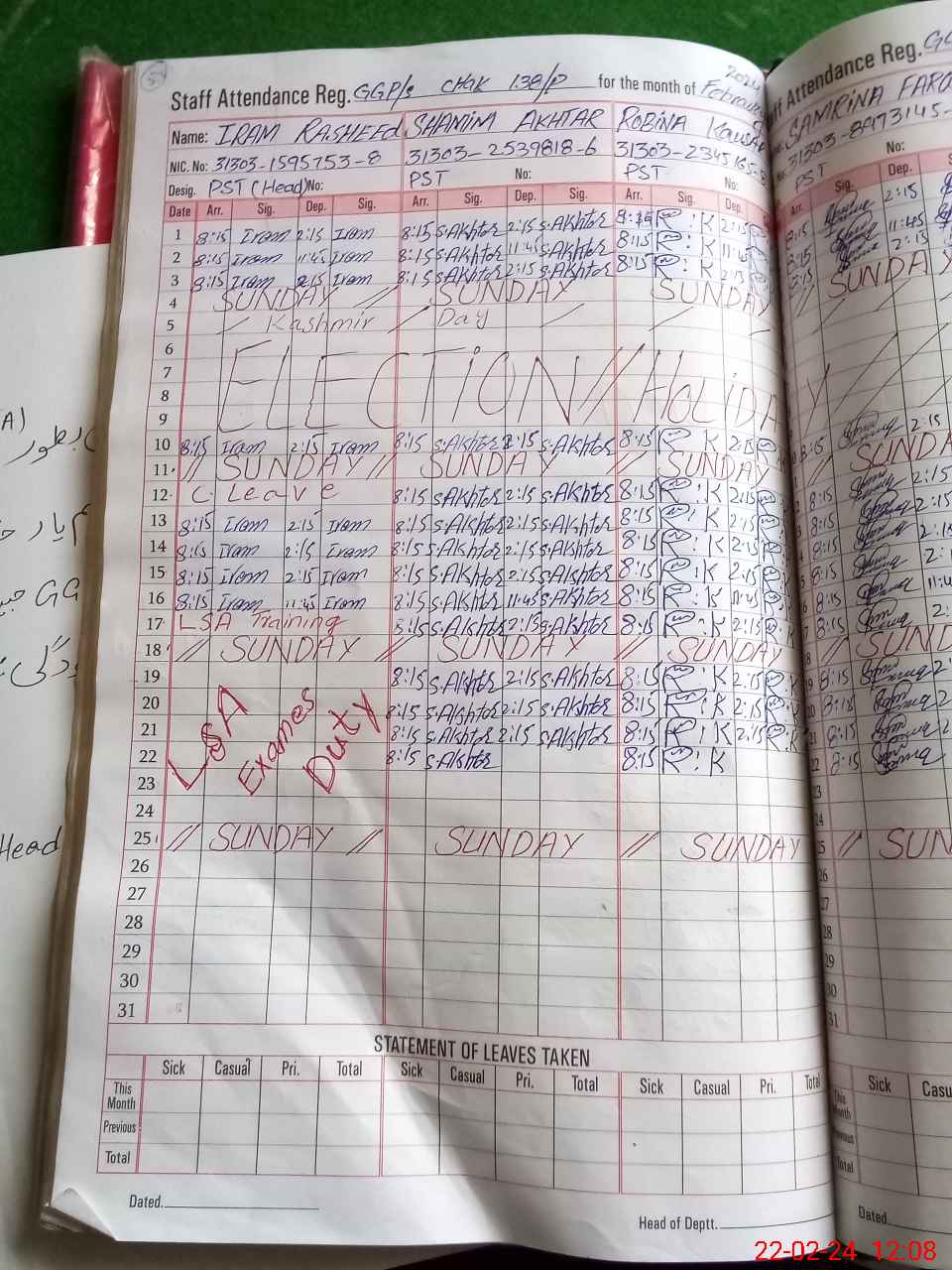 | CNIC | Full Name | Designation | R/C | Absence During Last Calender Month |