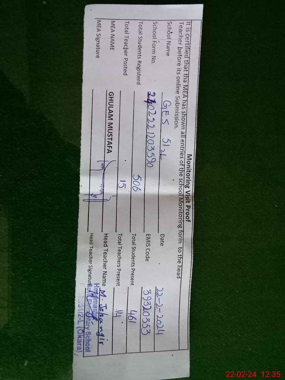 | Certified that this School was Inspected by the Undersigned MEA/DMO Today and the Information Stated Above is as Per Record. | |||||