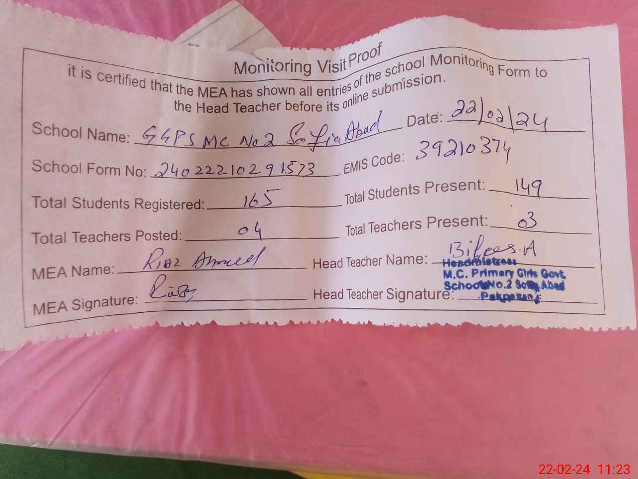 | Attendance Register | Head Teacher | MEA with School | Visit Proof |