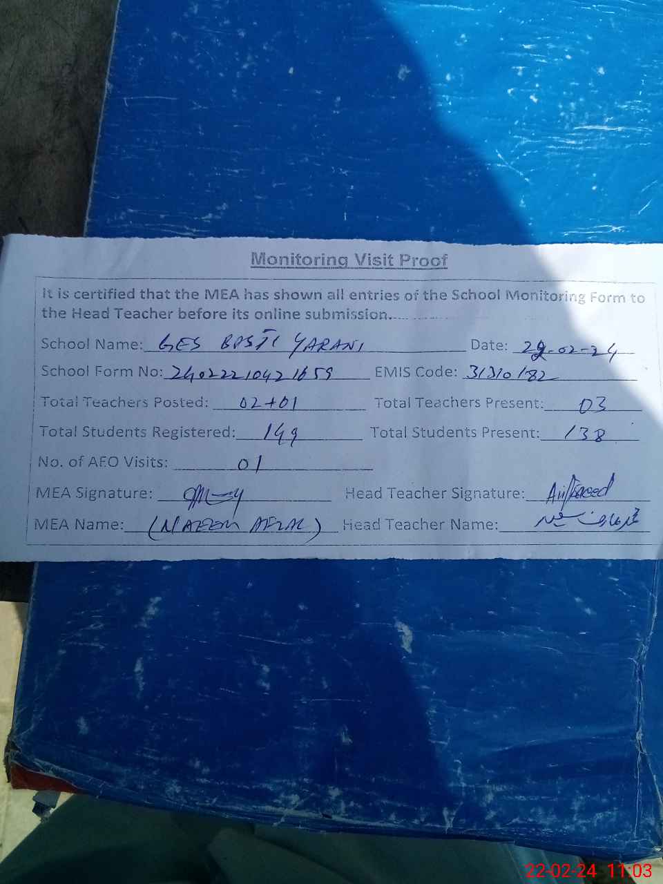 | Attendance Register | Head Teacher | MEA with School | Visit Proof |