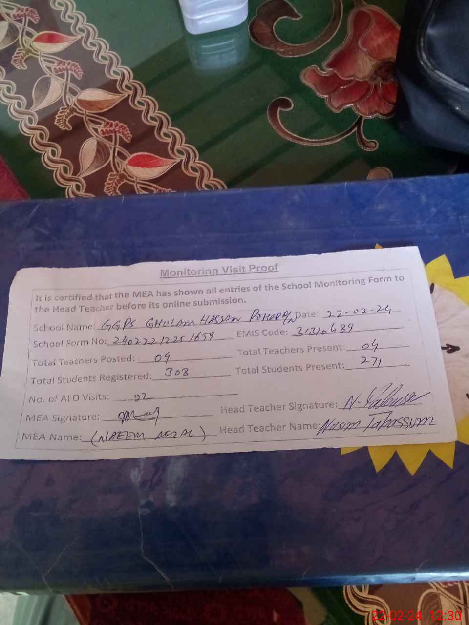 | EMIS Code: 31310489 | Name of School: GGPS BASTI JAM GHULAM HASSAN PAHOR (After Noon) | |||