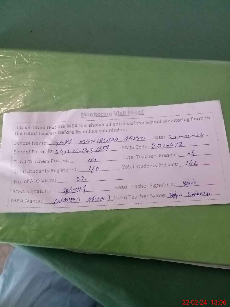 | Attendance Register | Head Teacher | MEA with School | Visit Proof |