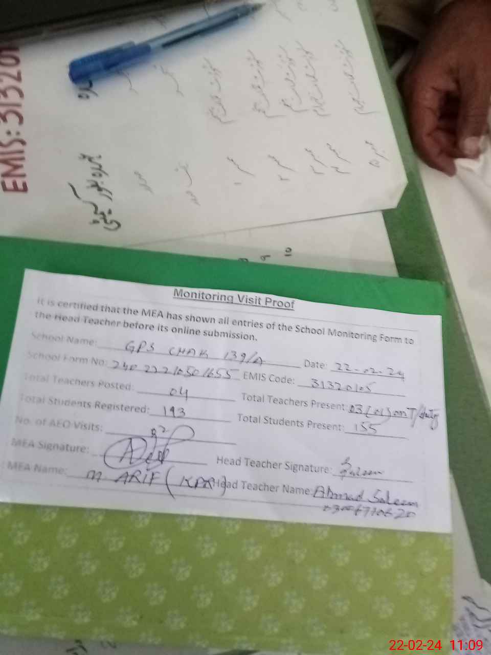 | Name: AH**** SA**** Designation: (School Headmaster's/Headmistress's) EST (GENERAL) Phone/Cell Number: 03**** |