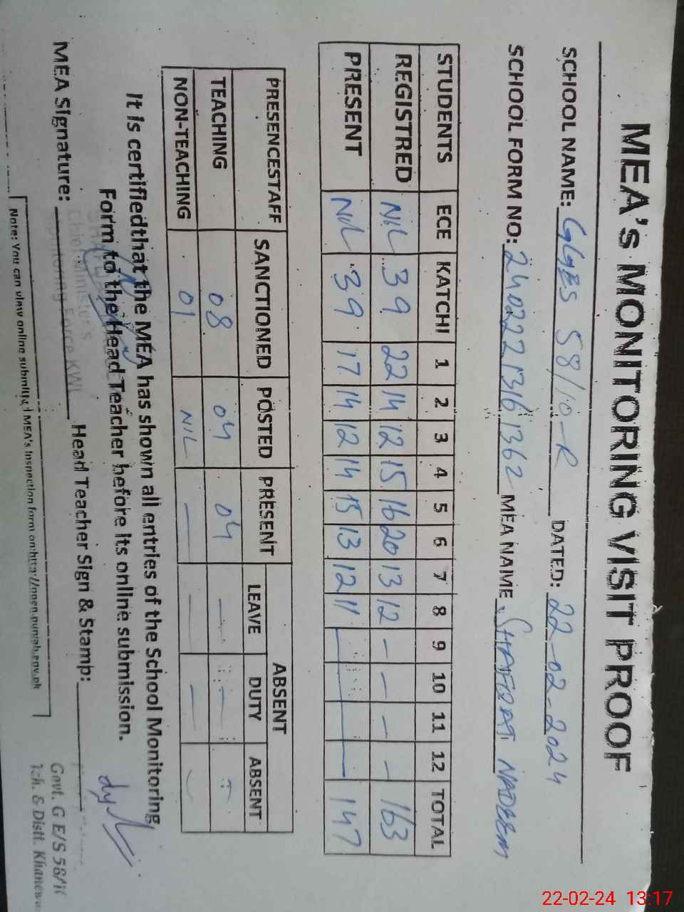 | Attendance Register | Head Teacher | MEA with School | Visit Proof |