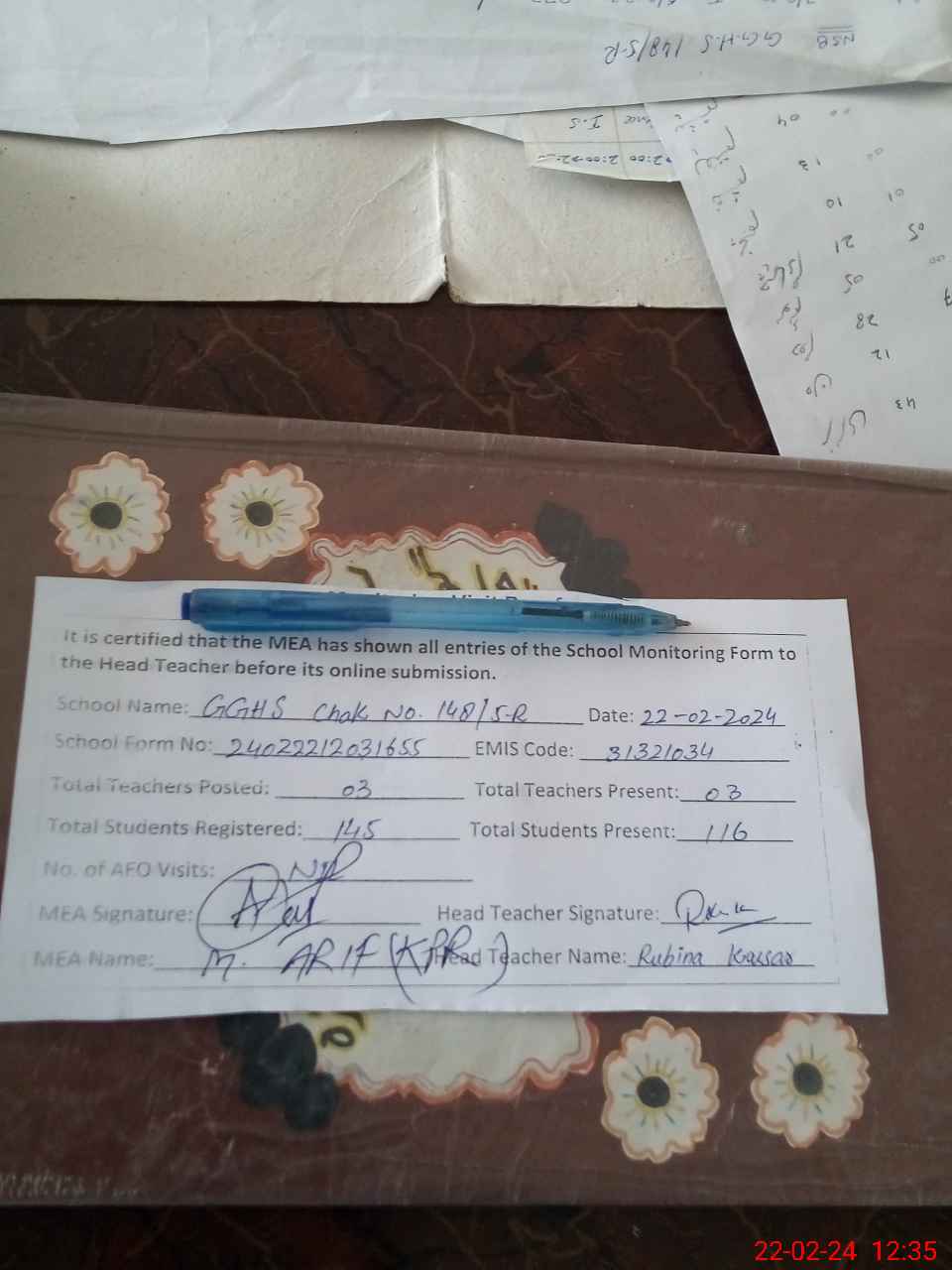 | Attendance Register | Head Teacher | MEA with School | Visit Proof |
