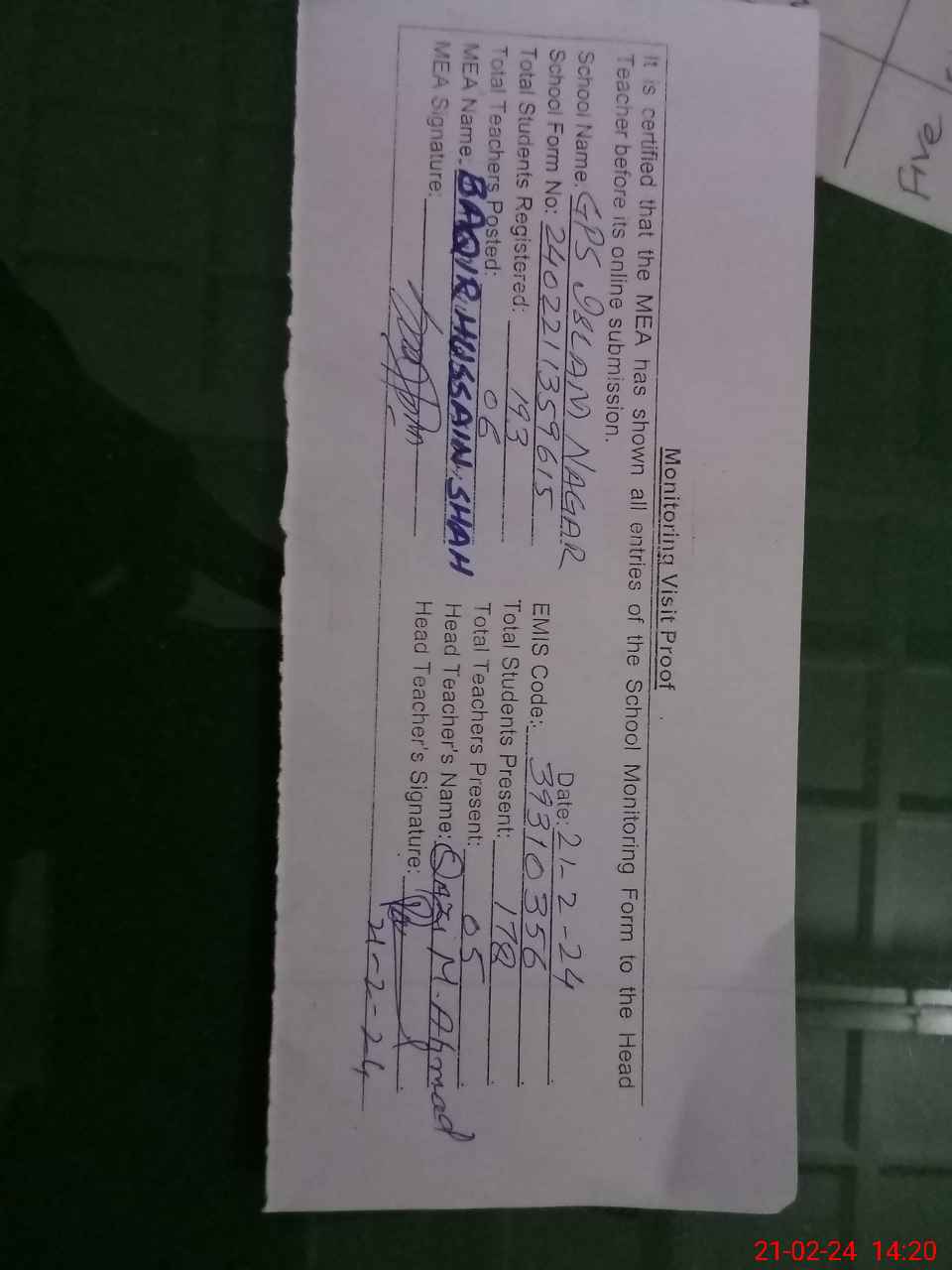 | Attendance Register | Head Teacher | MEA with School | Visit Proof |