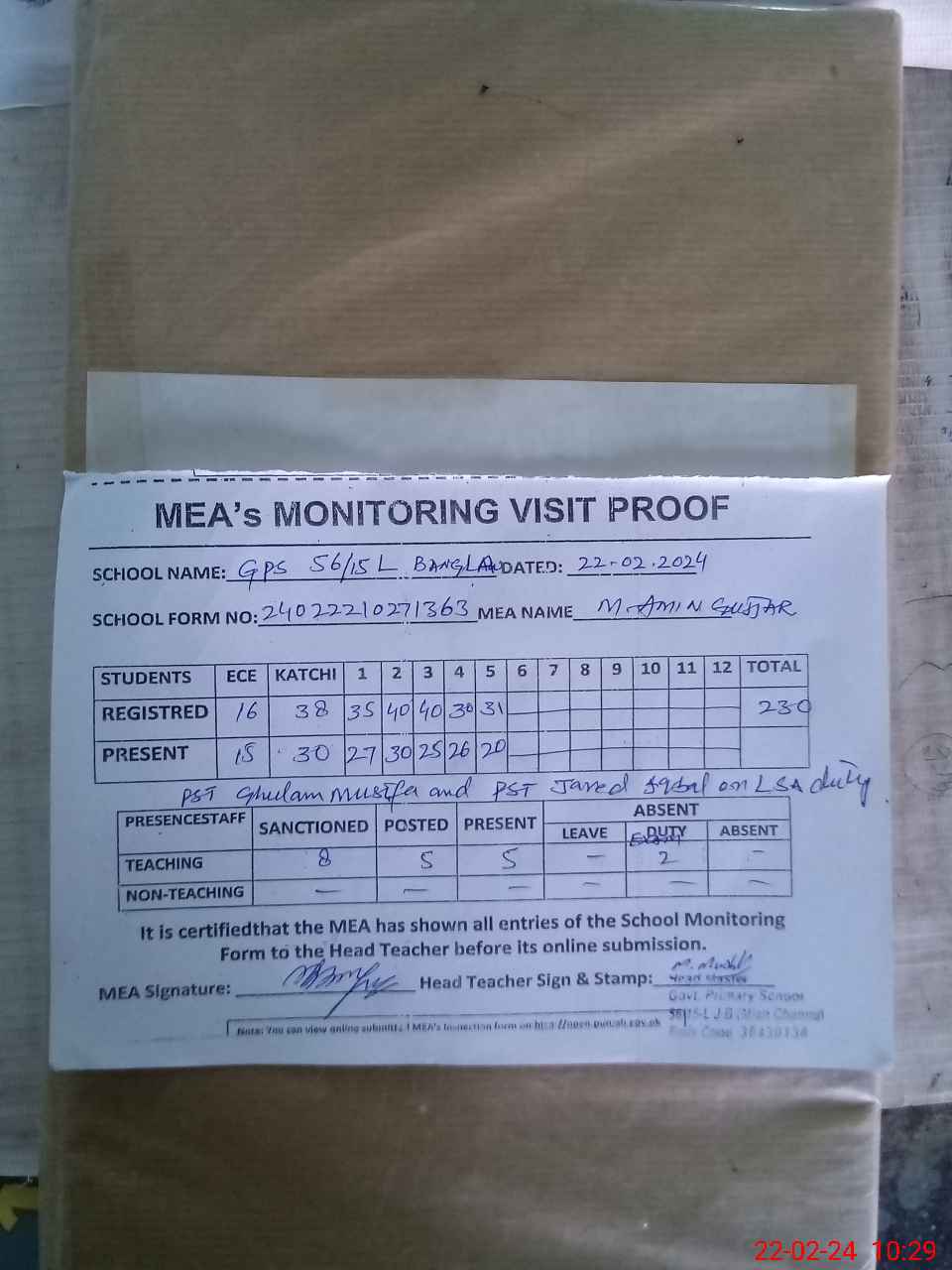 | Attendance Register | Head Teacher | MEA with School | Visit Proof |