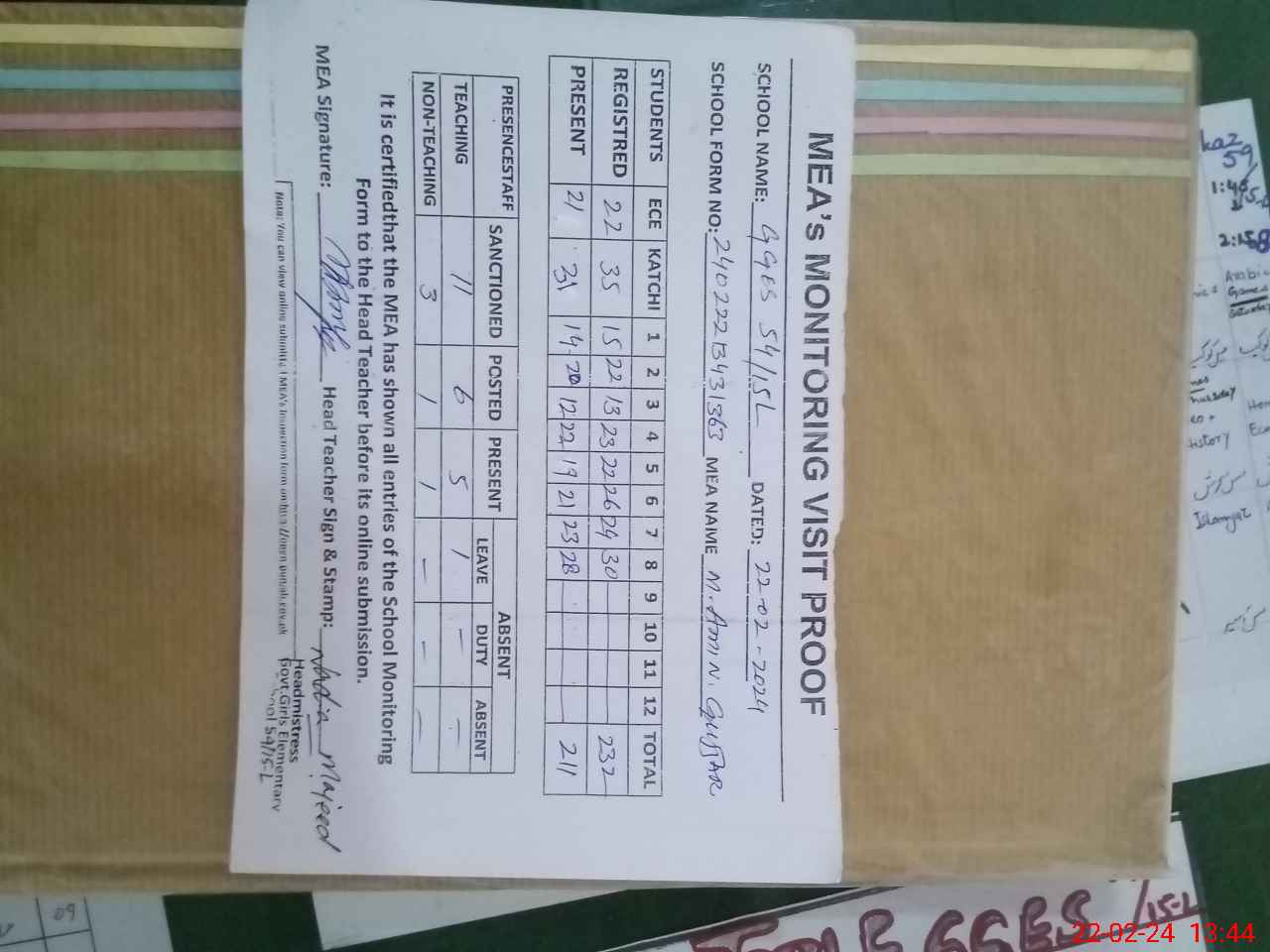 | Attendance Register | Head Teacher | MEA with School | Visit Proof |
