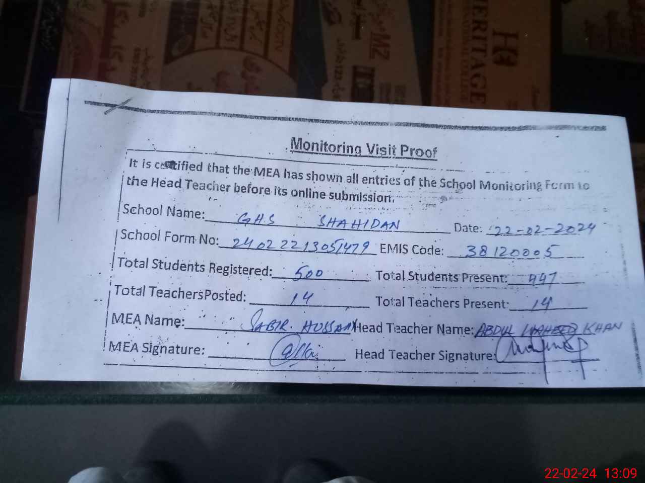 | Attendance Register | Head Teacher | MEA with School | Visit Proof |