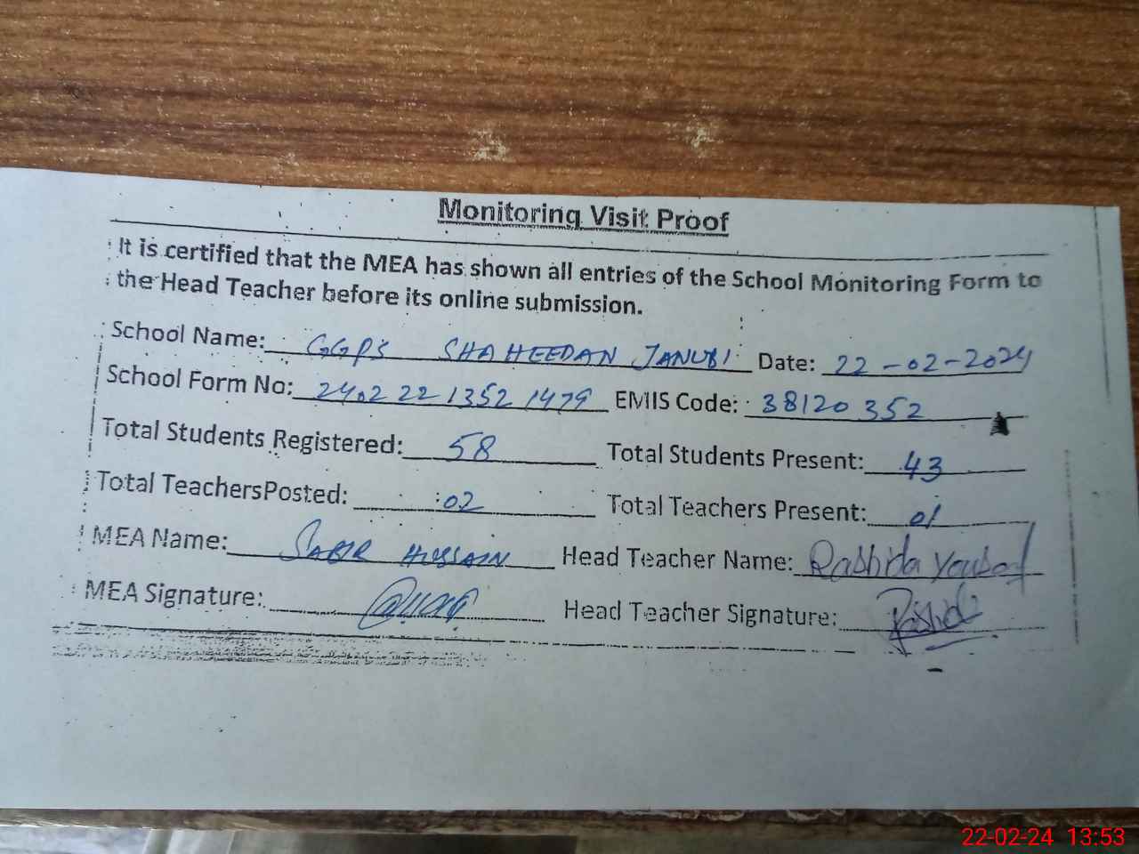 | Attendance Register | Head Teacher | MEA with School | Visit Proof |