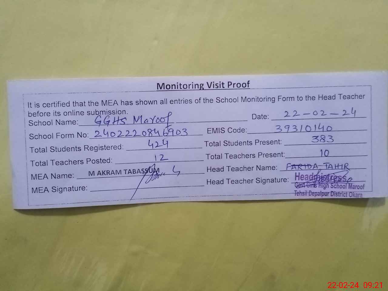 | Attendance Register | Head Teacher | MEA with School | Visit Proof |