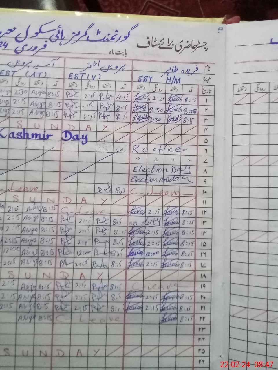 | CNIC | Full Name | Designation | R/C | Absence During Last Calender Month |