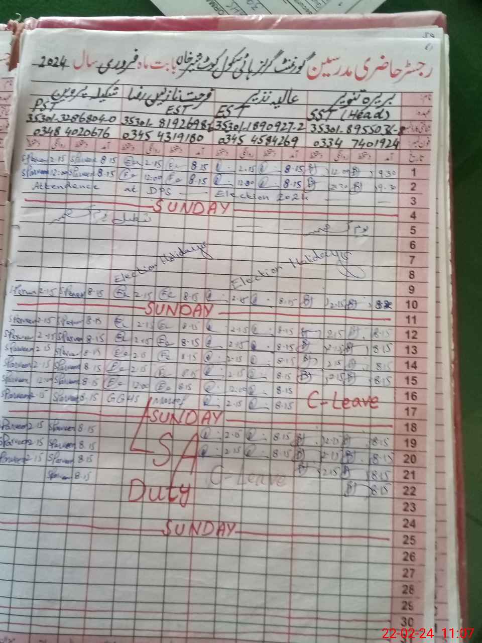 | 35**** | Fa**** Na**** Ra**** | 3 | 1 | 0 | 0 | 0 | 0 | 0 | 0 | 0 | 0 | 0 | Exam Duty |