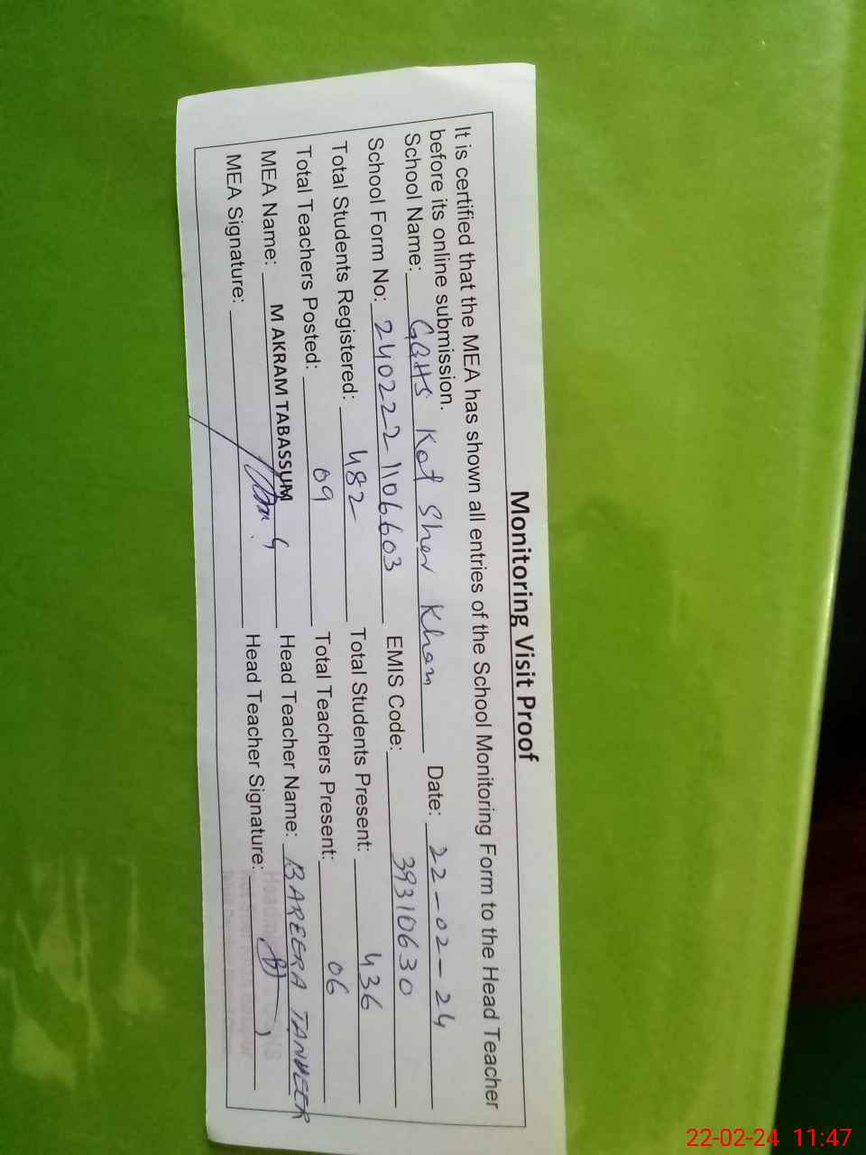 | EMIS Code: 39310630 | Name of School: GGHS KOT SHER KHAN | |||