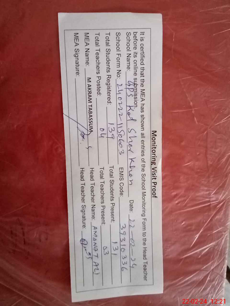 | EMIS Code: 39310336 | Name of School: GPS KOT SHER KHAN | |||