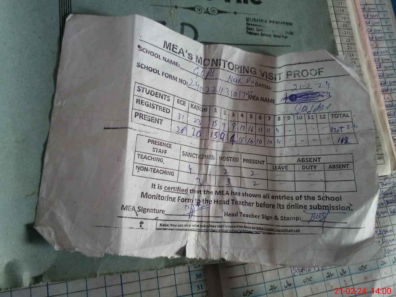 | Attendance Register | Head Teacher | MEA with School | Visit Proof |