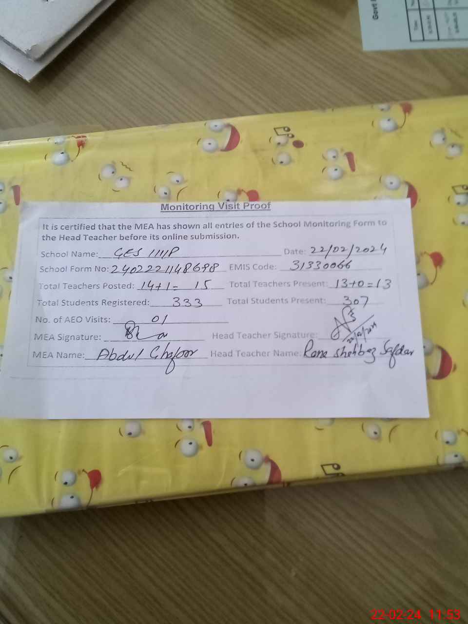 | EMIS Code: 31330066 | Name of School: GES CHAK NO. 111/P | |||