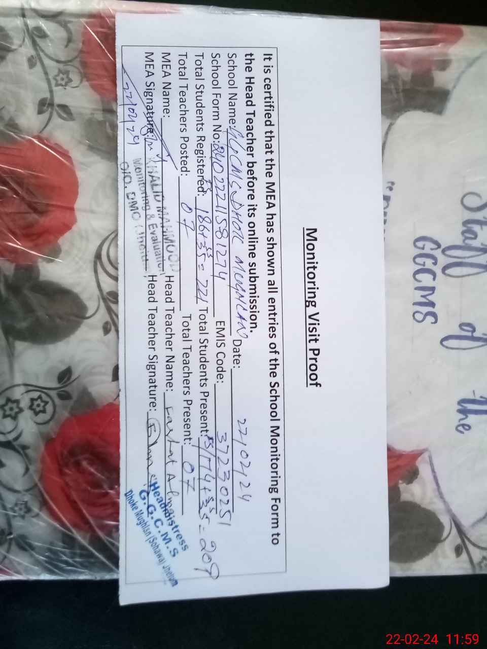 | Certified that this School was Inspected by the Undersigned MEA/DMO Today and the Information Stated Above is as Per Record. | |||||