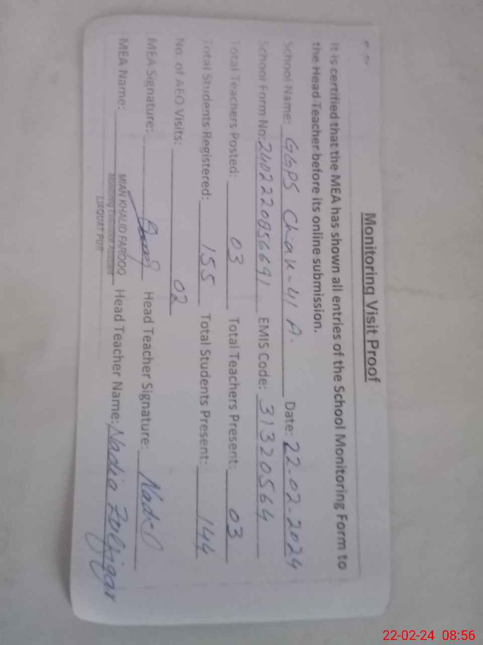 | EMIS Code: 31320564 | Name of School: GGPS CHAK 41/A | |||