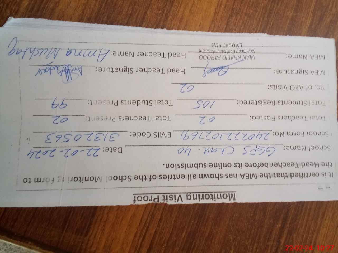 | Attendance Register | Head Teacher | MEA with School | Visit Proof |