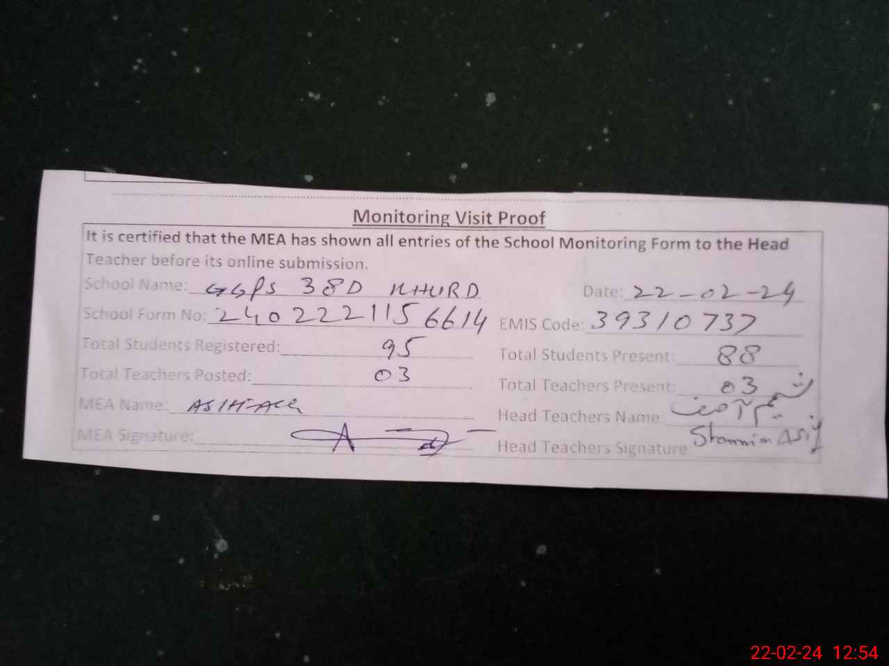 | Attendance Register | Head Teacher | MEA with School | Visit Proof |
