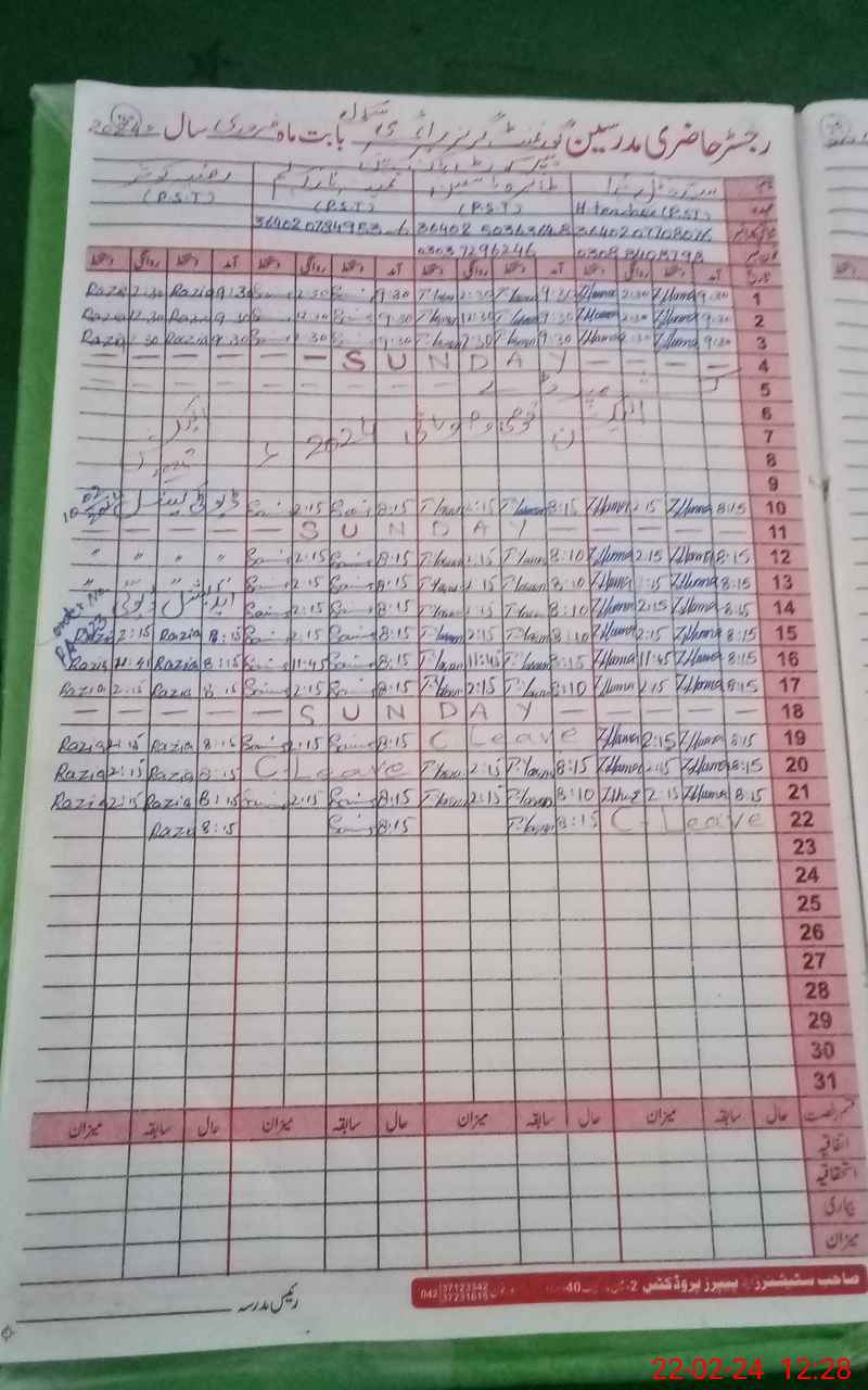 | CNIC | Full Name | Designation | R/C | Absence During Last Calender Month |