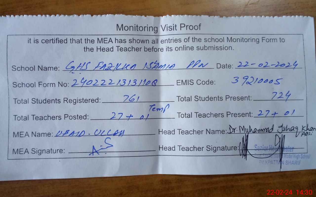 | EMIS Code: 39210005 | Name of School: GHS (MODEL) FAZILKA ISLAMIA PAKPATTAN | |||