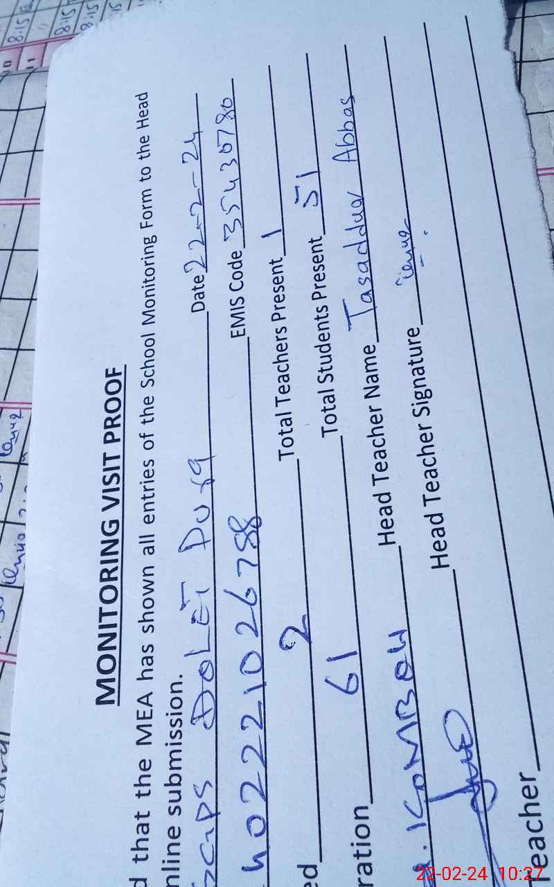 | Attendance Register | Head Teacher | MEA with School | Visit Proof |