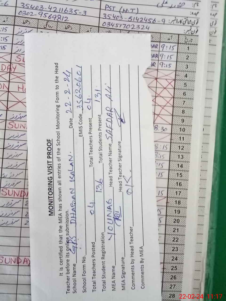 | Attendance Register | Head Teacher | MEA with School | Visit Proof |