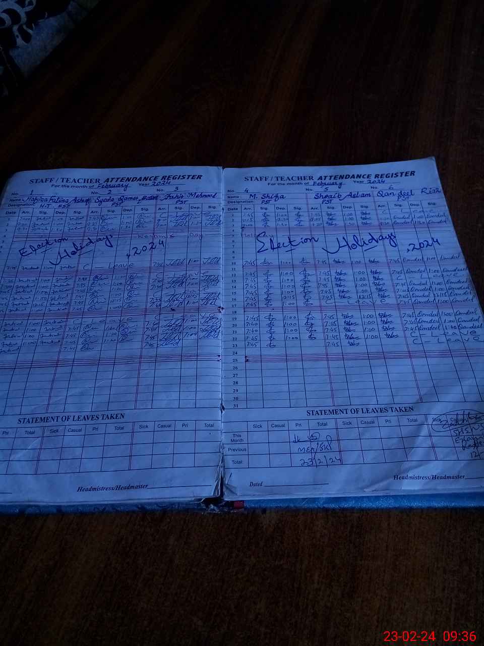 | 35**** | Qa**** Ri**** | ESE(Arts) | Temporary | 2 | 0 | 0 | 0 | 0 | 0 | 0 | 0 | 2 | Absent (Un-Authorized) |
