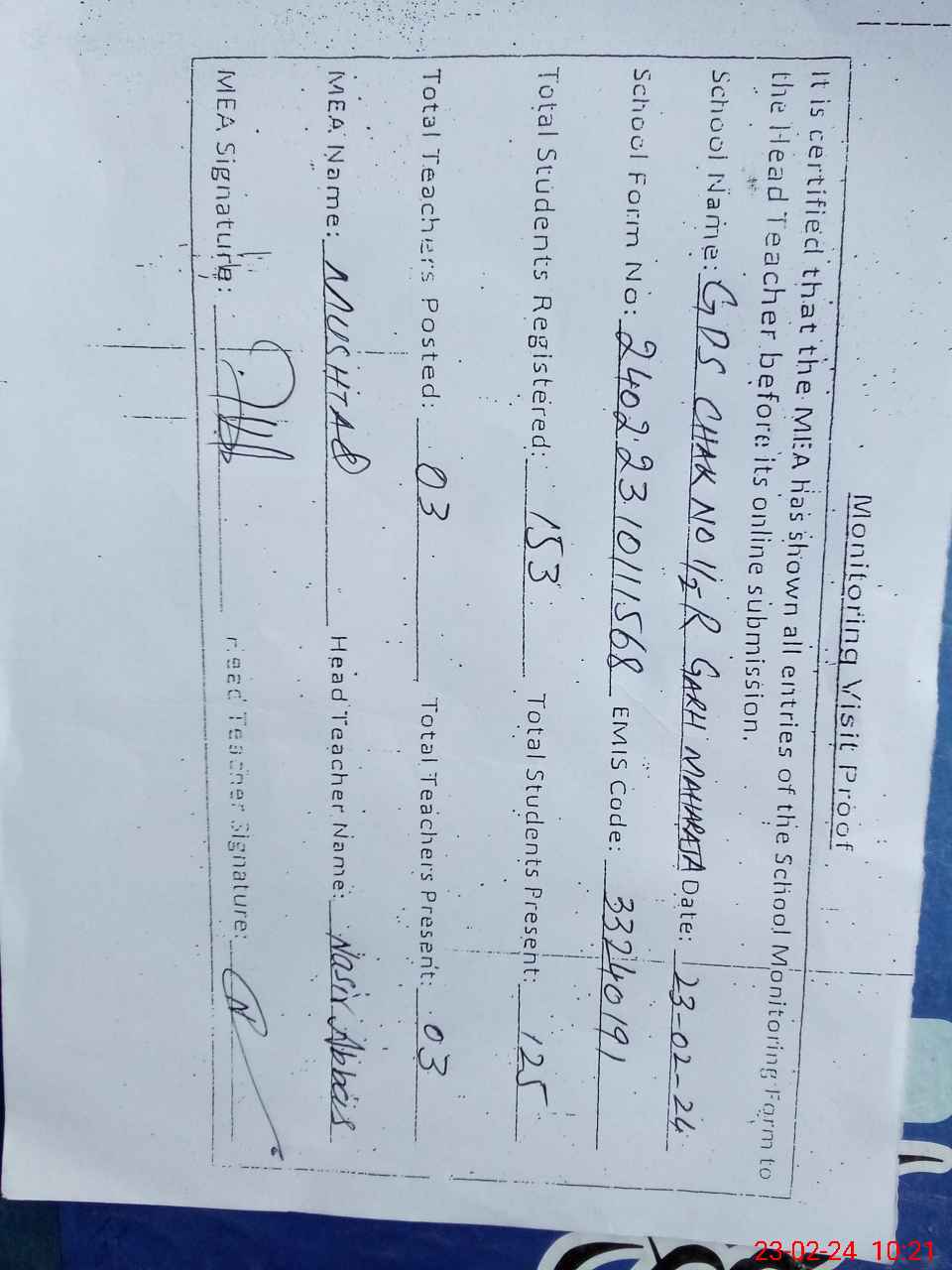 | EMIS Code: 33240191 | Name of School: GPS CHAK NO 1/2-R GARH MAHRAJA | |||