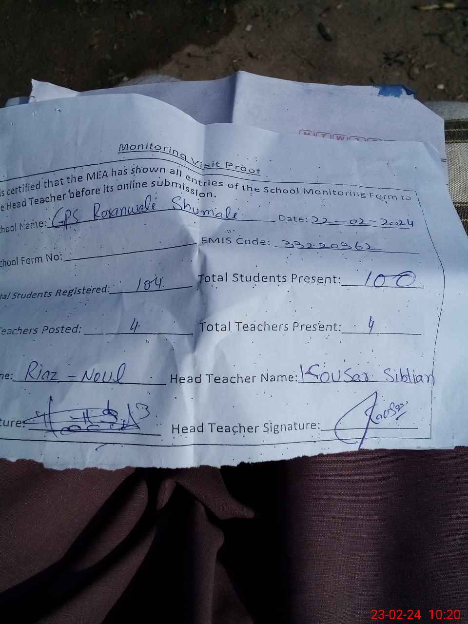 | Attendance Register | Head Teacher | MEA with School | Visit Proof |