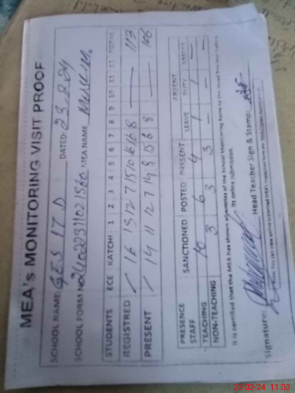 | Attendance Register | Head Teacher | MEA with School | Visit Proof |