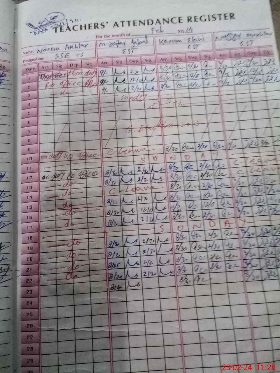 | CNIC | Full Name | Designation | R/C | Absence During Last Calender Month |