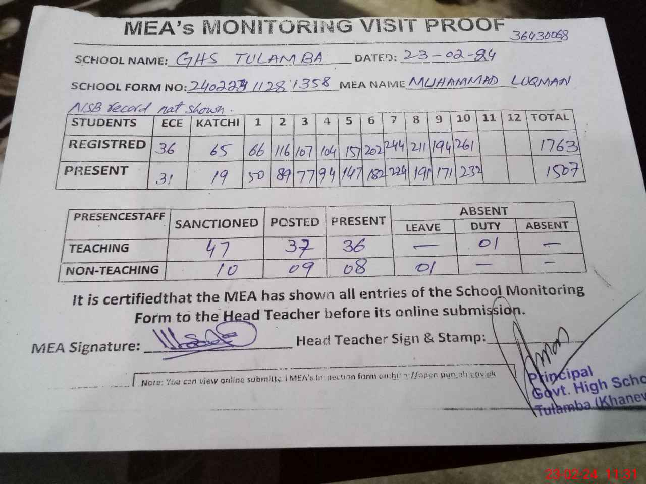| Attendance Register | Head Teacher | MEA with School | Visit Proof |