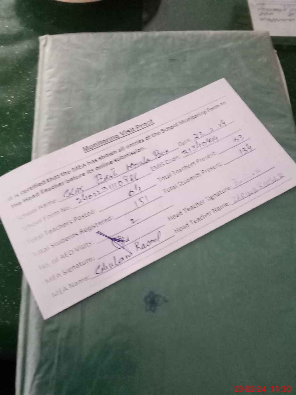| Attendance Register | Head Teacher | MEA with School | Visit Proof |