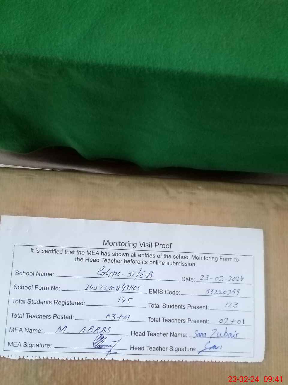 | Attendance Register | Head Teacher | MEA with School | Visit Proof |