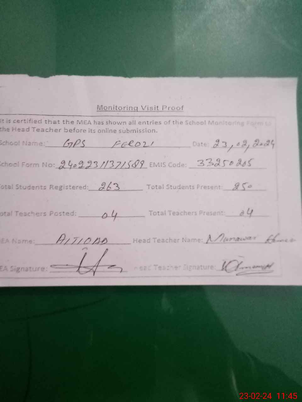 | EMIS Code: 33250205 | Name of School: GPS FEROZI | |||