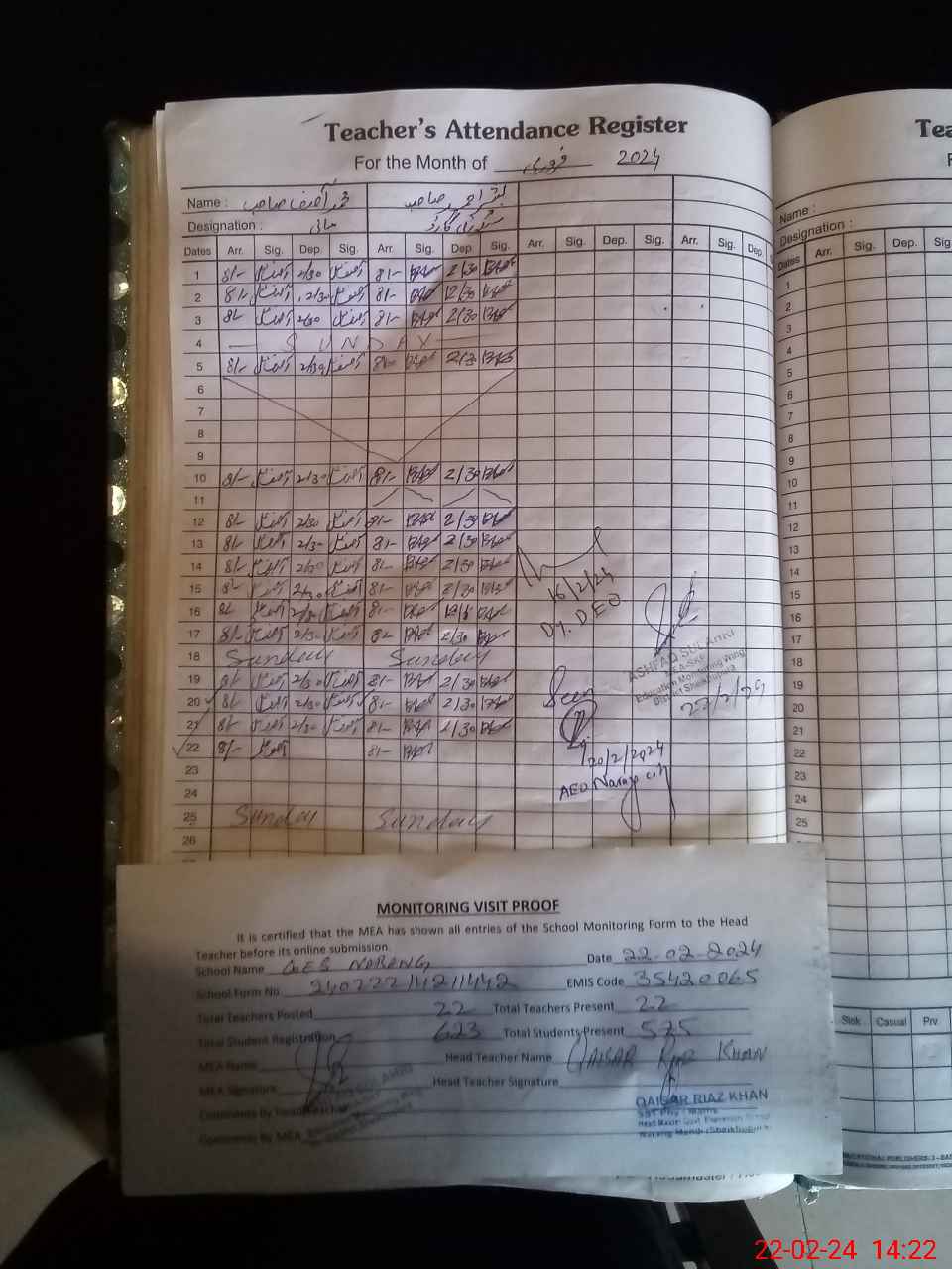 | Certified that this School was Inspected by the Undersigned MEA/DMO Today and the Information Stated Above is as Per Record. | |||||