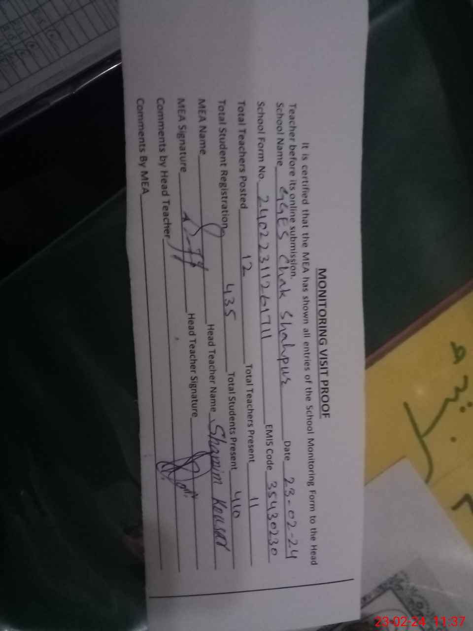 | Attendance Register | Head Teacher | MEA with School | Visit Proof |