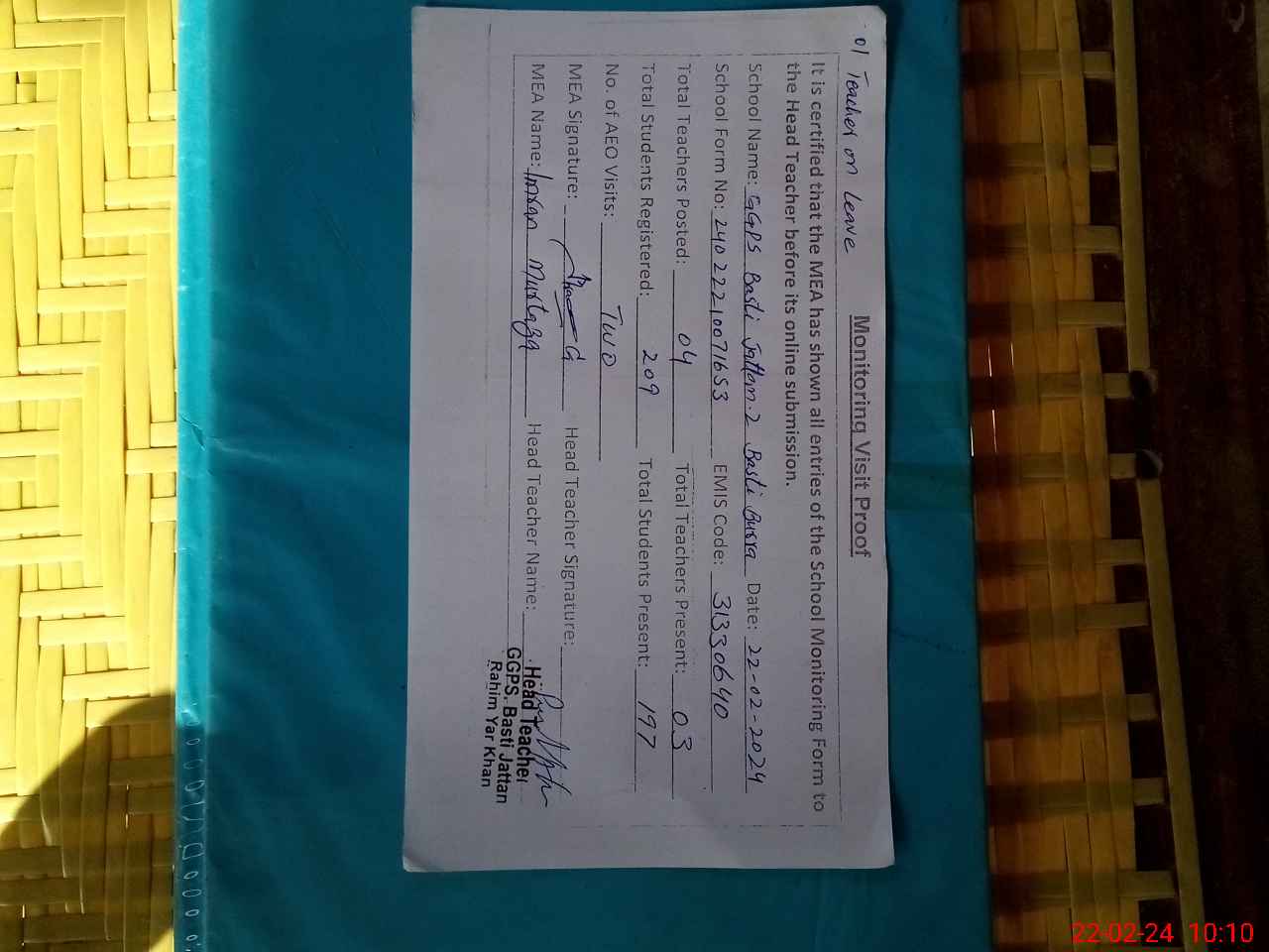 | Attendance Register | Head Teacher | MEA with School | Visit Proof |