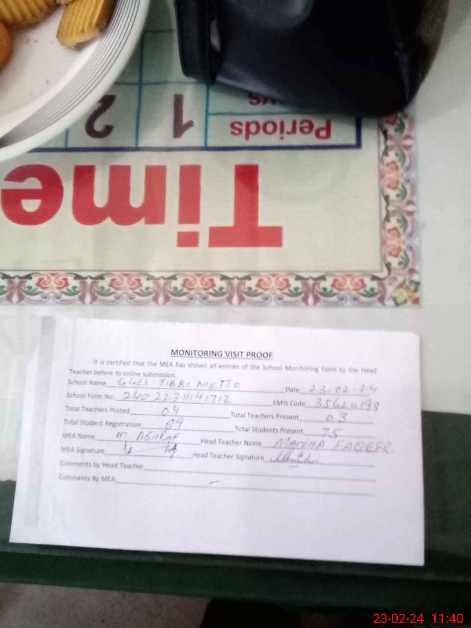 | Attendance Register | Head Teacher | MEA with School | Visit Proof |