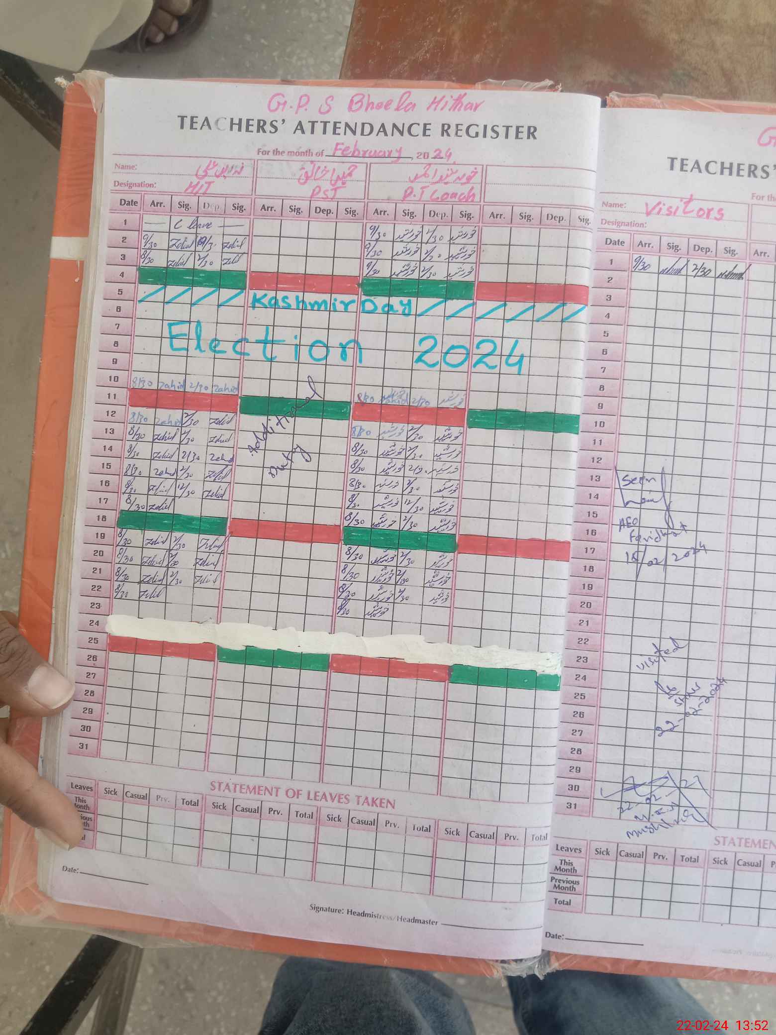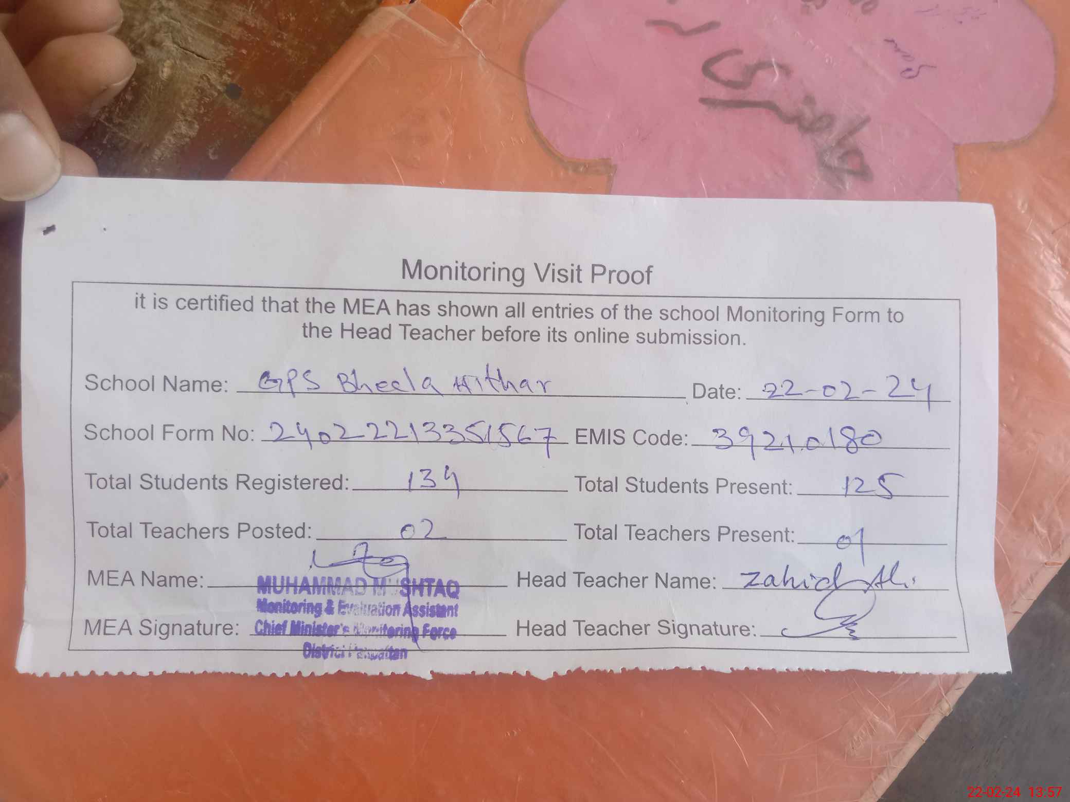 | Attendance Register | Head Teacher | MEA with School | Visit Proof |