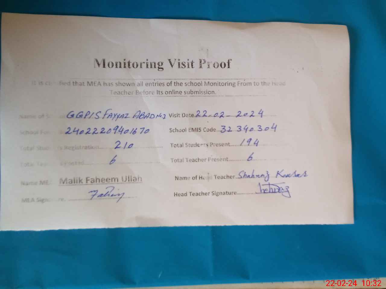 | EMIS Code: 32340304 | Name of School: GGPS FAYYAZ ABAD NO.2 | |||