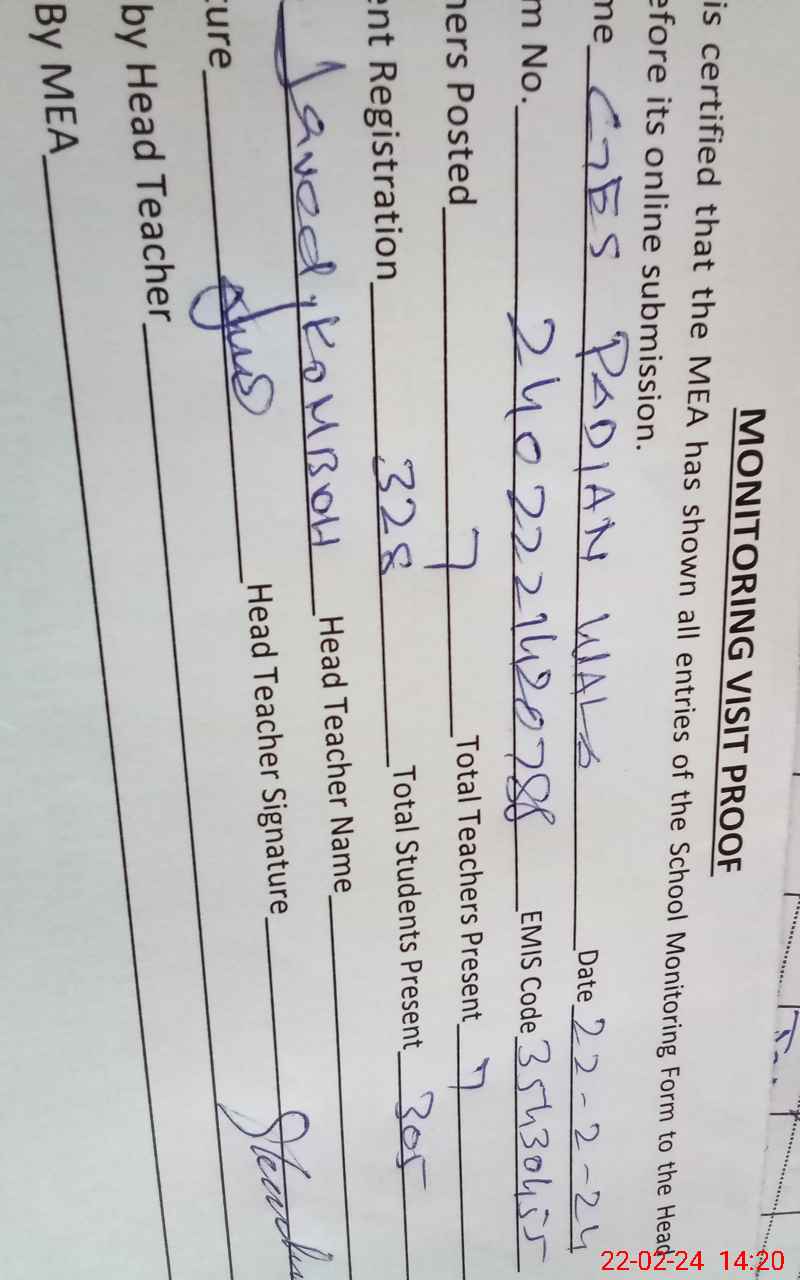 | Attendance Register | Head Teacher | MEA with School | Visit Proof |