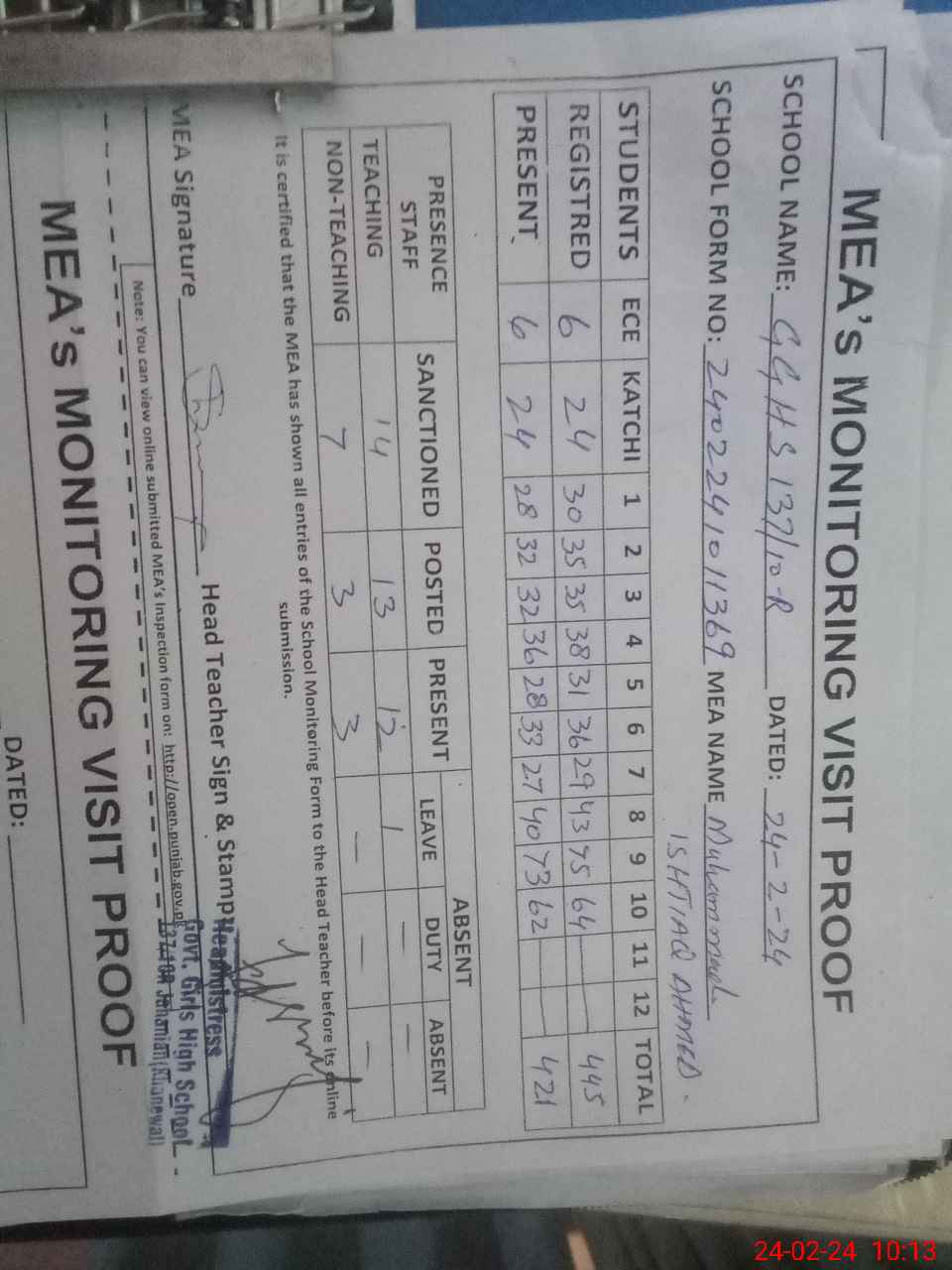 | Attendance Register | Head Teacher | MEA with School | Visit Proof |