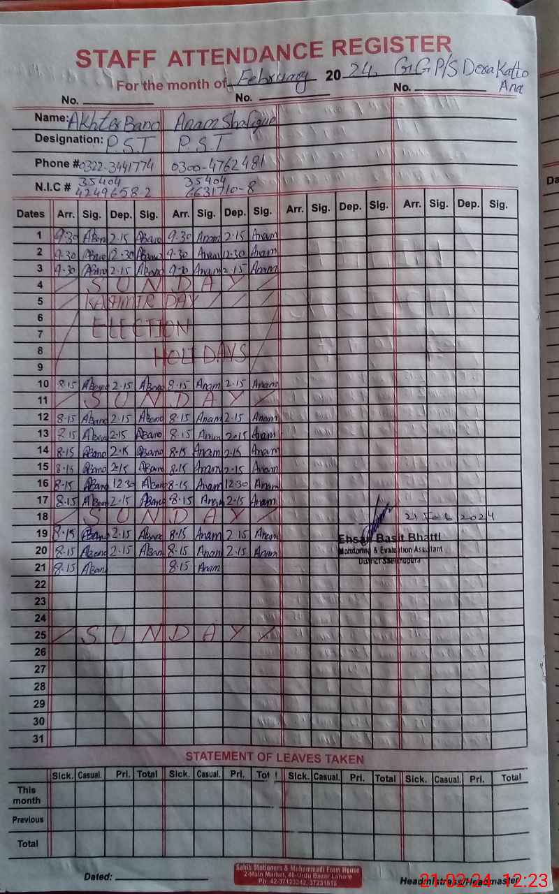 | Name: An**** Sh**** Designation: (School Headmaster's/Headmistress's) PST Phone/Cell Number: 03**** |
