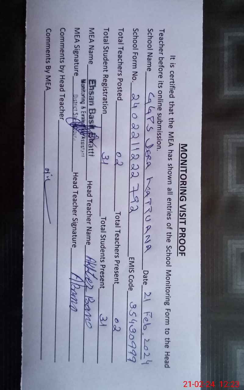 | EMIS Code: 35430999 | Name of School: GGPS DERA KATTU ANA | |||