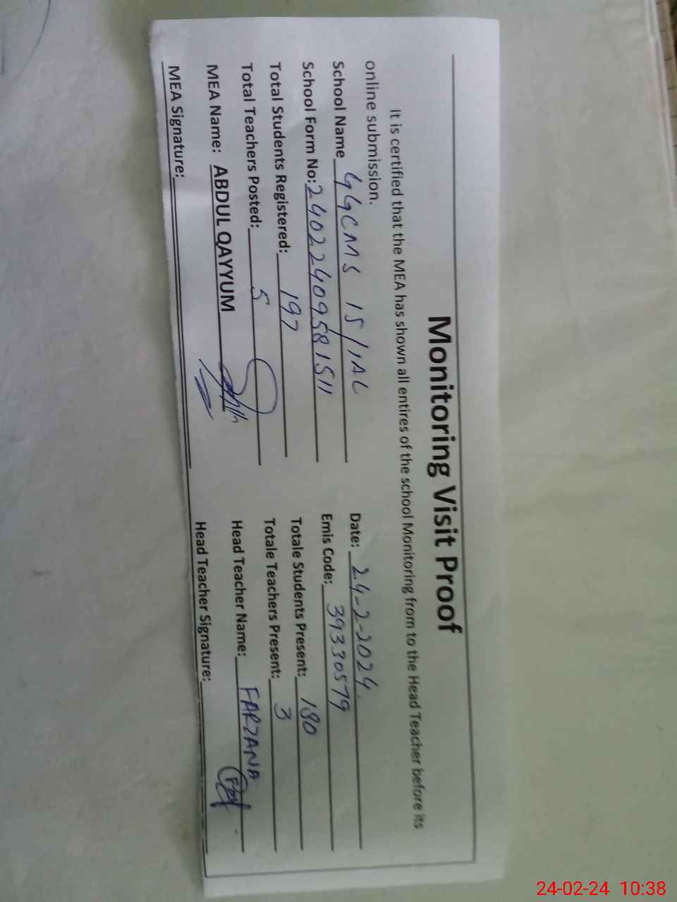 | Attendance Register | Head Teacher | MEA with School | Visit Proof |