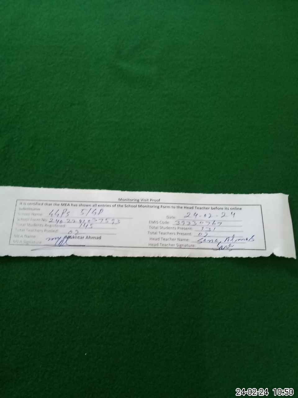 | Attendance Register | Head Teacher | MEA with School | Visit Proof |